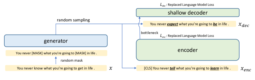 | 핵심 아이디어(방법론 요약) | 깊은 인코더 + 얕은(2층) 디코더를 [CLS] 병목으로만 연결(스킵 없음). 입력은 [MASK] 후 ELECTRA 생성기 분포에서 샘플링한 토큰으로 대체(Replaced LM)하여 인코더·디코더 양쪽 모두에서 원래 토큰 복원을 학습(전 위치 CE). 디코더 용량이 제한적이므로 복원을 잘하려면 인코더의 [CLS]가 의미를 강하게 압축해야 함. |