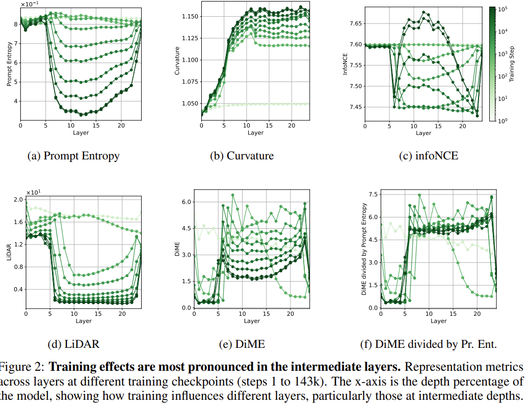 - 토큰 임베딩 궤적의 급회전/휘어짐을 본다. 저자들은 곡률·DiME·InfoNCE가 다운스트림 성능과 높은 상관을 보인다고 요약한다.