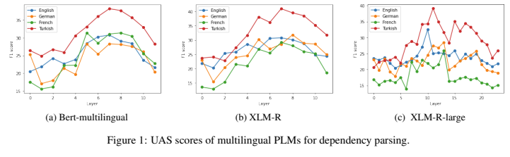 - 구성 파싱(F1): 언어 차는 있으나 레이어 패턴은 의존과 유사; XLM-R이 강세.