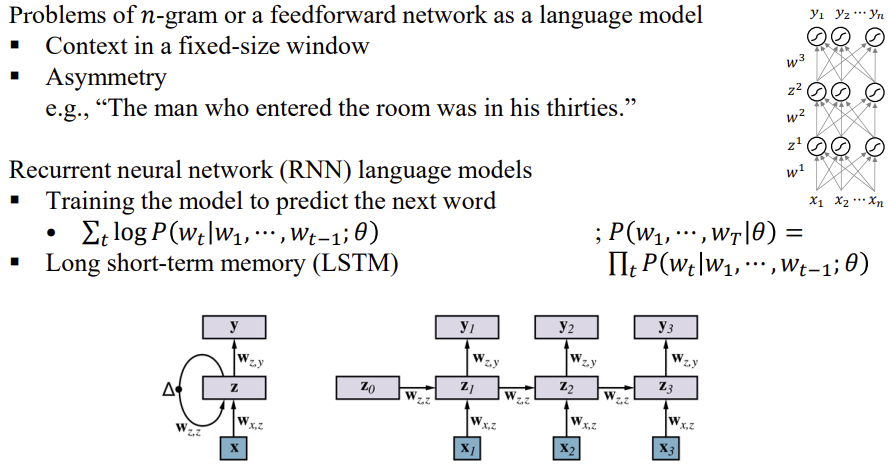 - RNN/LSTM LM: “다음 단어 예측”을 최대우도((\sum_t \log P(w_t|w_{<t})))로 학습. 고정 창 제약은 줄지만 장기 의존·병렬화 한계 존재.