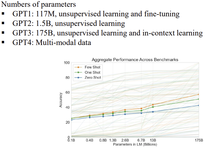- 파라미터 수: GPT-1 117M → GPT-2 1.5B → GPT-3 175B(in-context learning) → GPT-4(멀티모달). 모델·데이터·컴퓨팅 스케일업이 성능과 범용성을 견인.