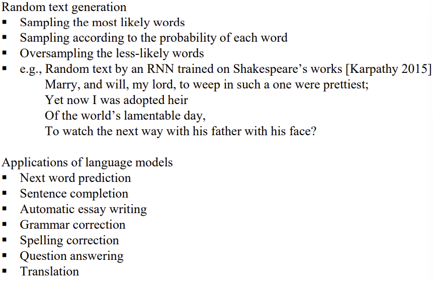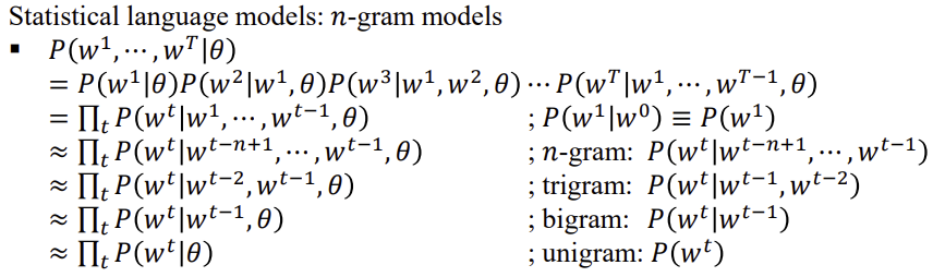 - 통계적 LM (n-gram): (P(w_t|w_{t-n+1:t-1}))로 근사. 긴 의존성·가변 길이 문맥을 다루기 어렵고 데이터 희소성 문제가 큼. (슬라이드의 bigram/trigram 예시)