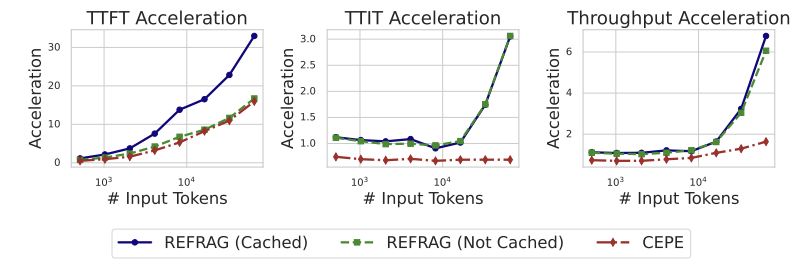 - 동일 지연시간(입력 길이) 조건에서는 REFRAG가 유의미하게 상회(더 많은 정보를 같은 레이턴시 안에 ‘효율적으로’ 소비).