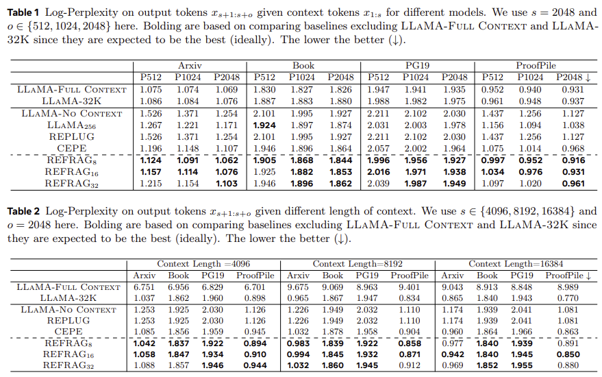 - 표 2(대표): REFRAG(8/16/32) 가 CEPE 보다 고르게 낮은 log-PPL(↓)을 보이며, LLaMA-No-Context/REPLUG 대비 개선.
