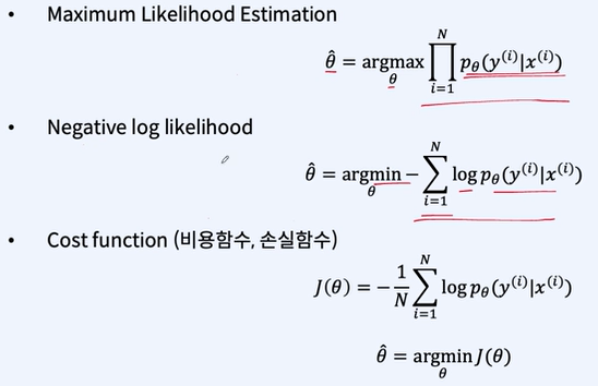확률은 0보다 작기 때문에 모두 곱하면 0에 가까워진다. -> negative log likelihood라는 방식을 사용해 곱이 아닌 합을 사용하여 최솟값을 찾기