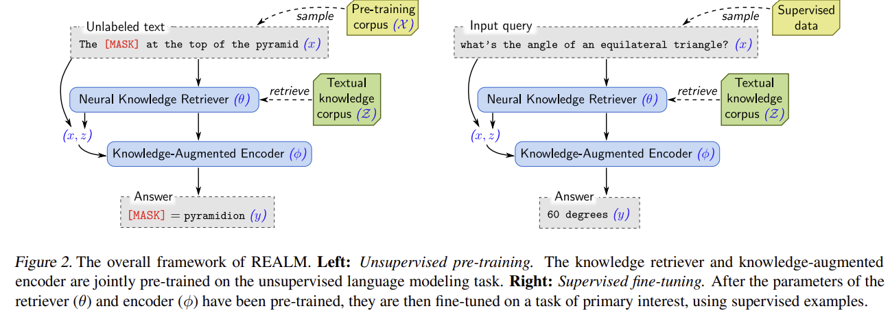 - 아이디어: 입력 (x)에 대해 문서 (z)를 먼저 검색하고( (p(z\mid x)) ), 그 문서를 활용해 정답 (y) 를 예측( (p(y\mid z,x)) )하는 잠재변수 모델로 사전학습을 수행한다. 목적함수는 (\sum_{z} p(y\mid z,x)p(z\mid x)).