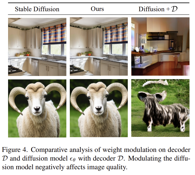 | 어블레이션(디자인 선택) | 디코더만 변조 vs ϵθ+디코더 동시 변조: 후자는 품질 크게 악화(Fig. 4), 정확도도 ~89%로 하락 → 디코더만 변조가 최적. |