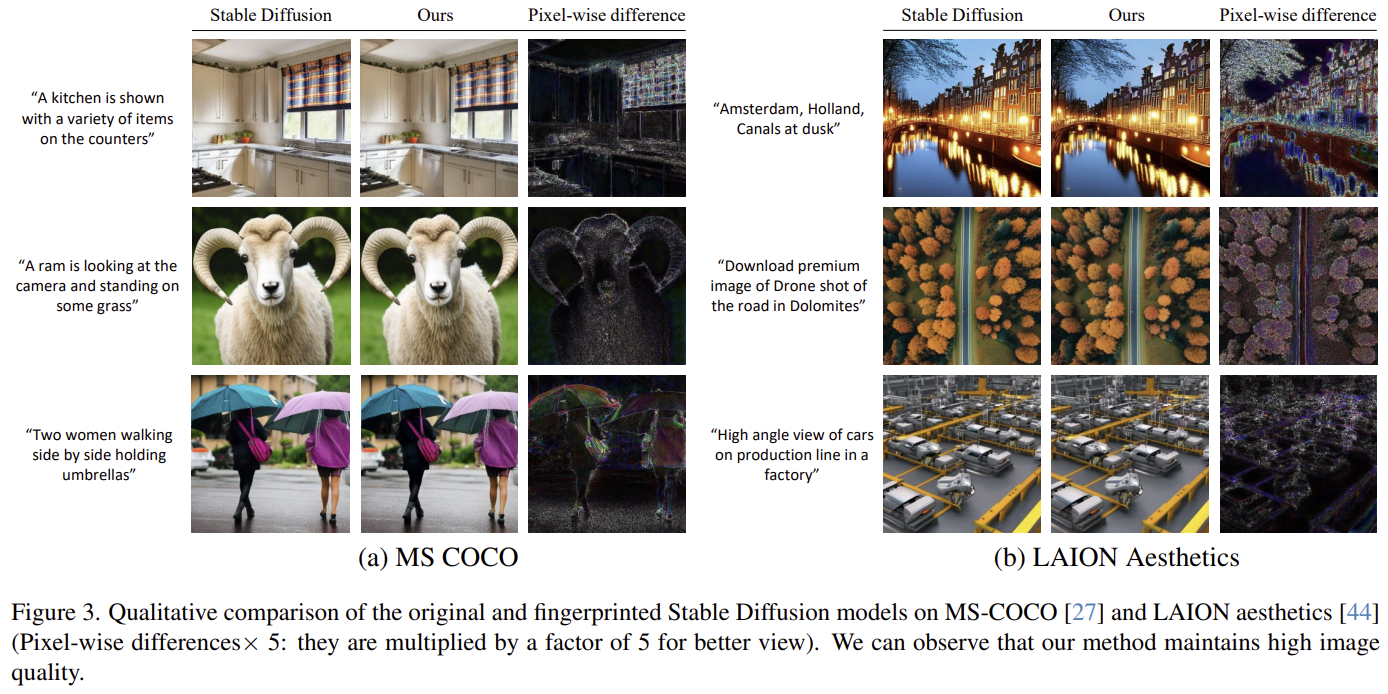 | 주요 결과(정량) | COCO/LAION에서 귀속 정확도 0.99, CLIP/FID 거의 동일. 지문 주입 시간 <1초(DAG 8.4h, Stable Signature <1m). (Table 1) |