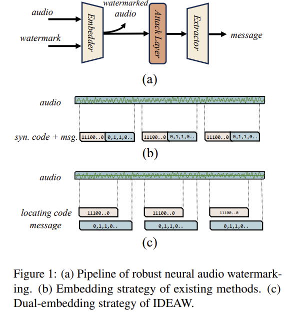 신경망 기반 오디오 워터마킹은 공격을 견디도록 강건성은 좋아졌지만 여전히 용량이 낮고, 품질이 별로며, 워터마크 위치 찾기가 느리고 비효율적임