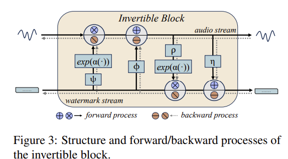 - 각 INN 블록은 오디오 스트림 x와 워터마크 스트림 s(m 또는 c)을 함께 변환: