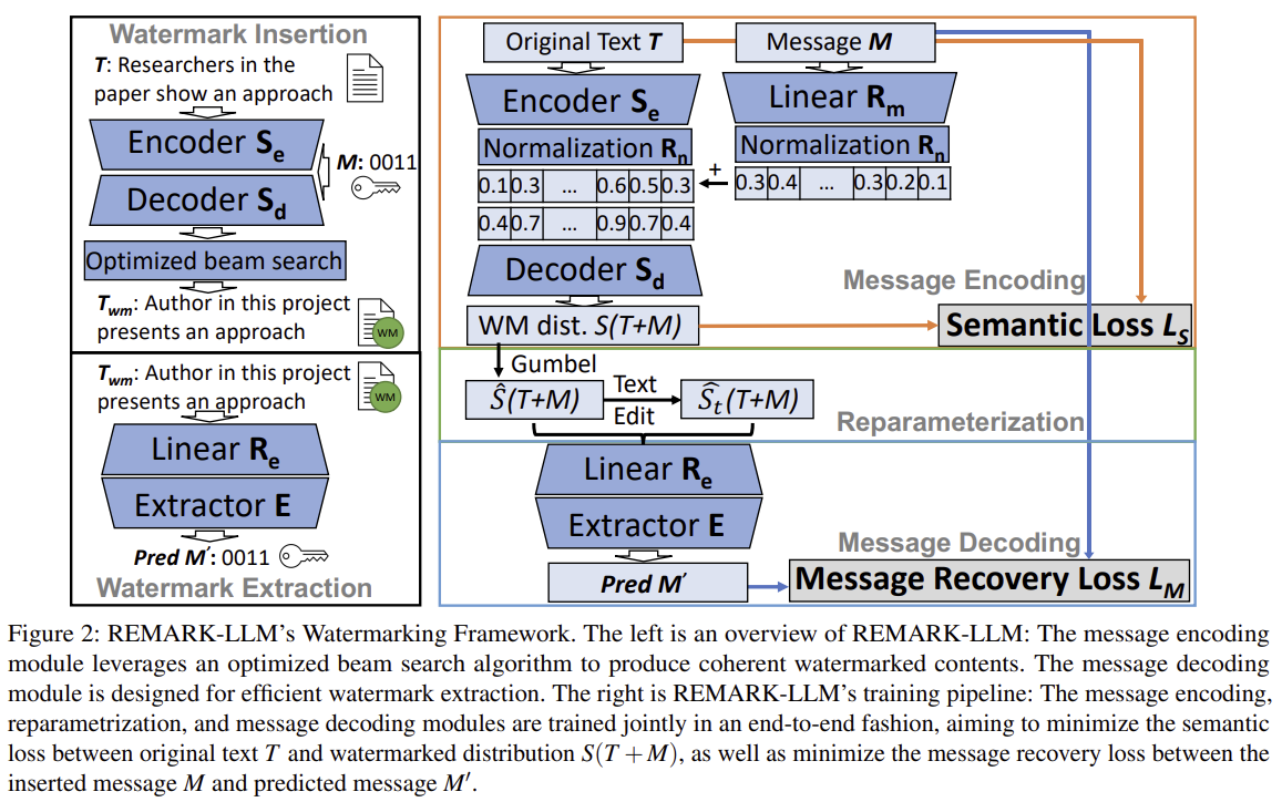 | 학습 목표 | Semantic Loss: 원본 T와 watermark 분포 S(T+M)의 의미를 유지 Message Recovery Loss: 삽입 메시지 M과 추출 메시지 M′의 차이를 최소화 Malicious Transform Loss: 삭제·삽입·치환의 공격 입력 Ŝₜ에서도 M 복원 |