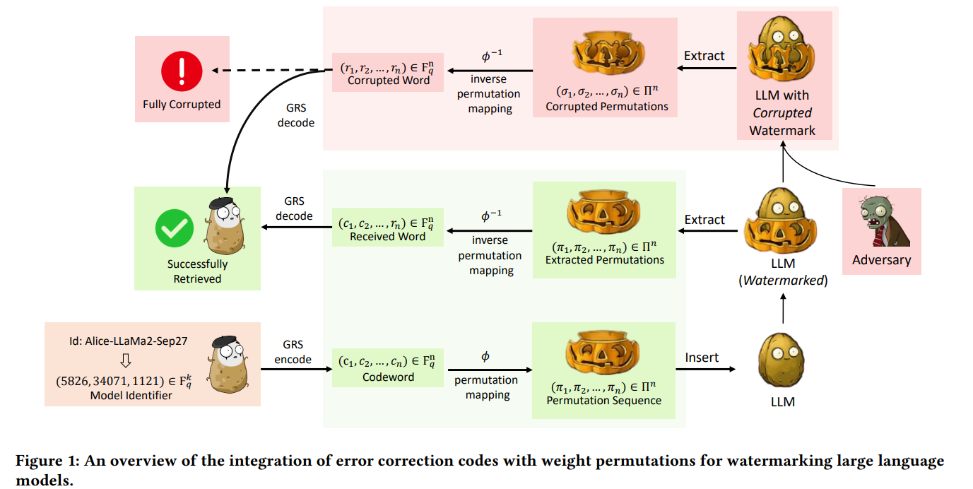 | 방법론 | 1. Model ID를 유한체 GF(q)의 길이 k 메시지로 변환 2. GRS(n,k) 코드로 메시지를 인코딩하여 에러·에러레이저 복구 가능한 codeword 생성 3. codeword 각 심볼을 inverse-free derangement로 매핑 → permutation sequence 생성 4. permutation을 LLM 내부 FIT-permutation slots에 삽입 (weight 재배열) 5. 공격 후 모델에서 weight 비교를 통해 permutation 추출 (linear assignment) 6. 추출한 permutation을 φ⁻¹으로 symbol로 변환 → corruption 발생 시 erasure 처리 7. GRS decoding으로 원래 ID 복원 또는 corrupted 판단 |