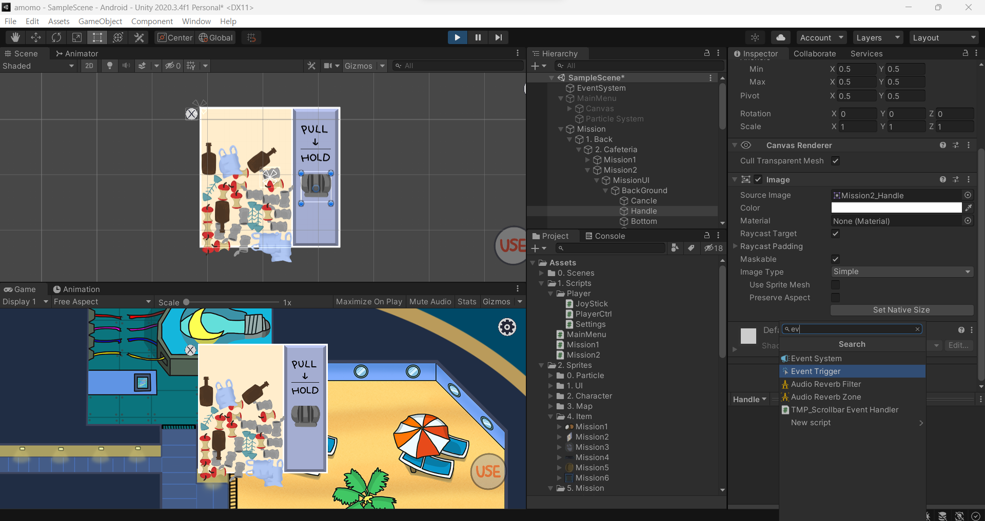 그 후 mission 2에 핸들 넣어주고, handle에서 event trigger를 아래와 같이 만들어 준다.