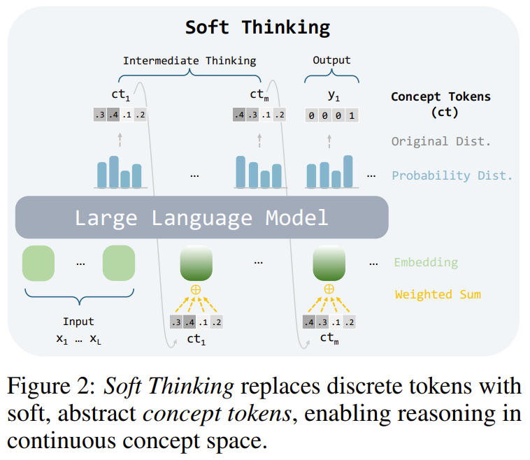 ✔ Soft Thinking은 “출력 logits으로 embedding을 재조정한다"