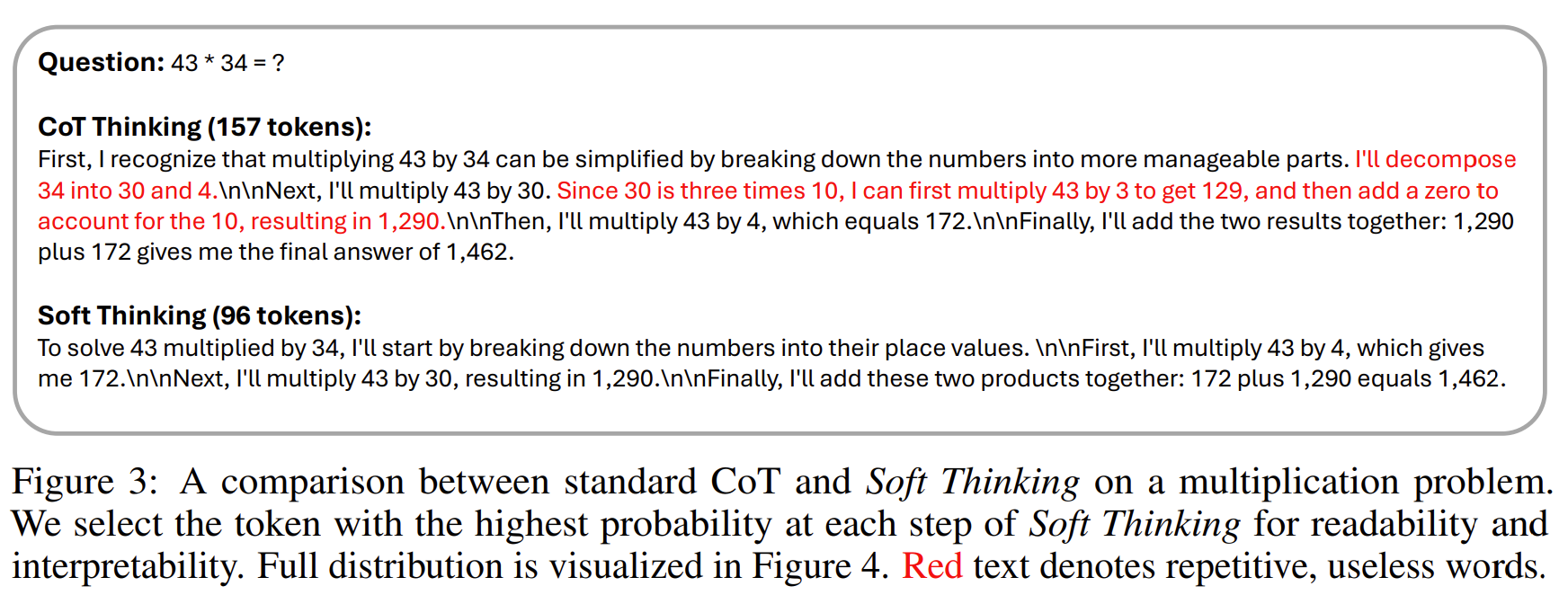 - 개념의 해석성 / 설명성 문제: discrete CoT은 사람이 읽을 수 있는 reasoning chain(rationale)을 제공하지만, Soft Thinking에서 중간 thought은 사실상 “벡터의 흐름”이기 때문에 사람이 중간 reasoning을 이해하거나 점검하기 어렵다.