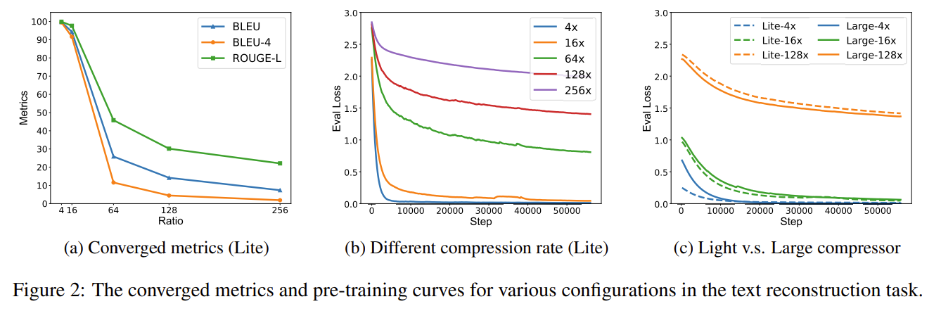 - Stage 1: 짧은 문장(128 tokens), 4x 압축, reconstruction 중심 (32M tokens)