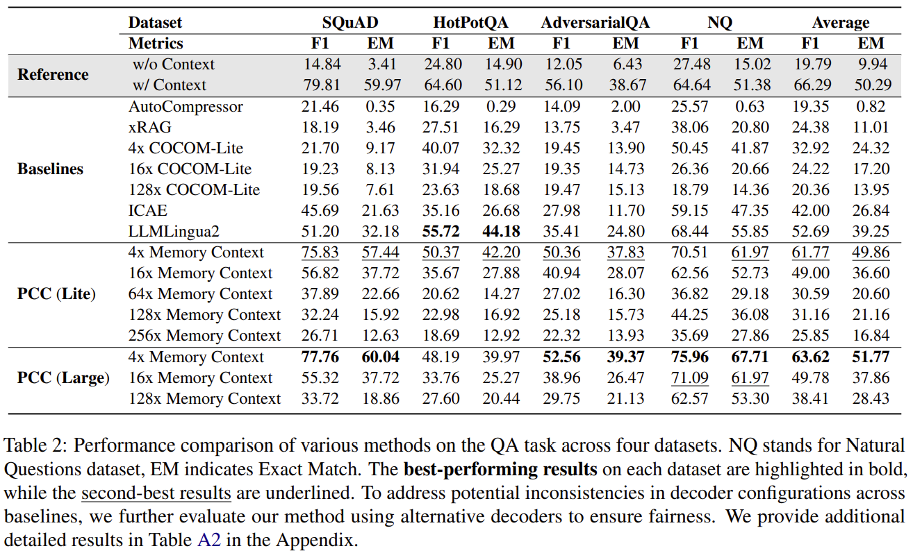 | 주요 결과 | Reconstruction • 4×, 16×: BLEU ≈ 100, 98 → 원문 복원 가능 • 64×↑: 정보 손실 심각, 복원 불가 RAG QA • Full context F1=66.29 • PCC Large 4×: F1=63.62 (~96%) • Baseline(LLMLingua2=52.69, ICAE=42.00, COCOM<40) 대비 압도적 성능 ICL • 4× compression이 explicit 750-token ICL보다 성능 우수 • WSC에서 최고 성능 기록(69.55) Role-playing • 4× compression이 few-shot role-play보다 낮은 perplexity 다양한 LLM에서 Generalization • Mistral / Qwen / Phi에서도 4× memory가 모두 성능 개선을 만듦 |