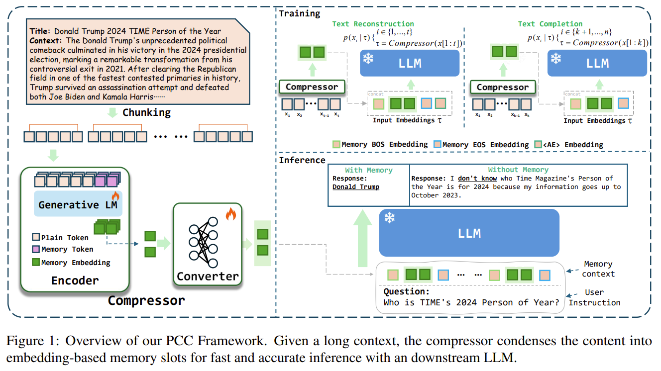 Long context -> Chunking -> Compressor(memory encoder -> converter) -> Inference