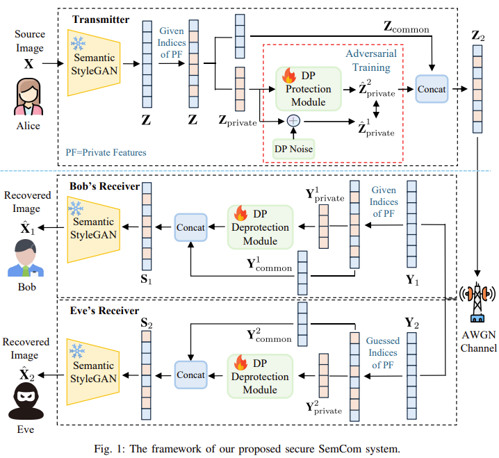 Semantic StyleGAN 기반의 얼굴 SemCom 시스템에서 잠복 표현(latent code)의 “프라이버시 민감 부분”만 선택적으로 DP 노이즈(패턴을 학습한 노이즈)로 보호하고, 합법 수신자만 이 노이즈 패턴을 제거하도록 학습함으로써, Bob은 고품질 복원을 유지하면서 Eve는 얼굴을 거의 알아볼 수 없게 만드는 DP 기반 보안 SemCom 프레임워크.