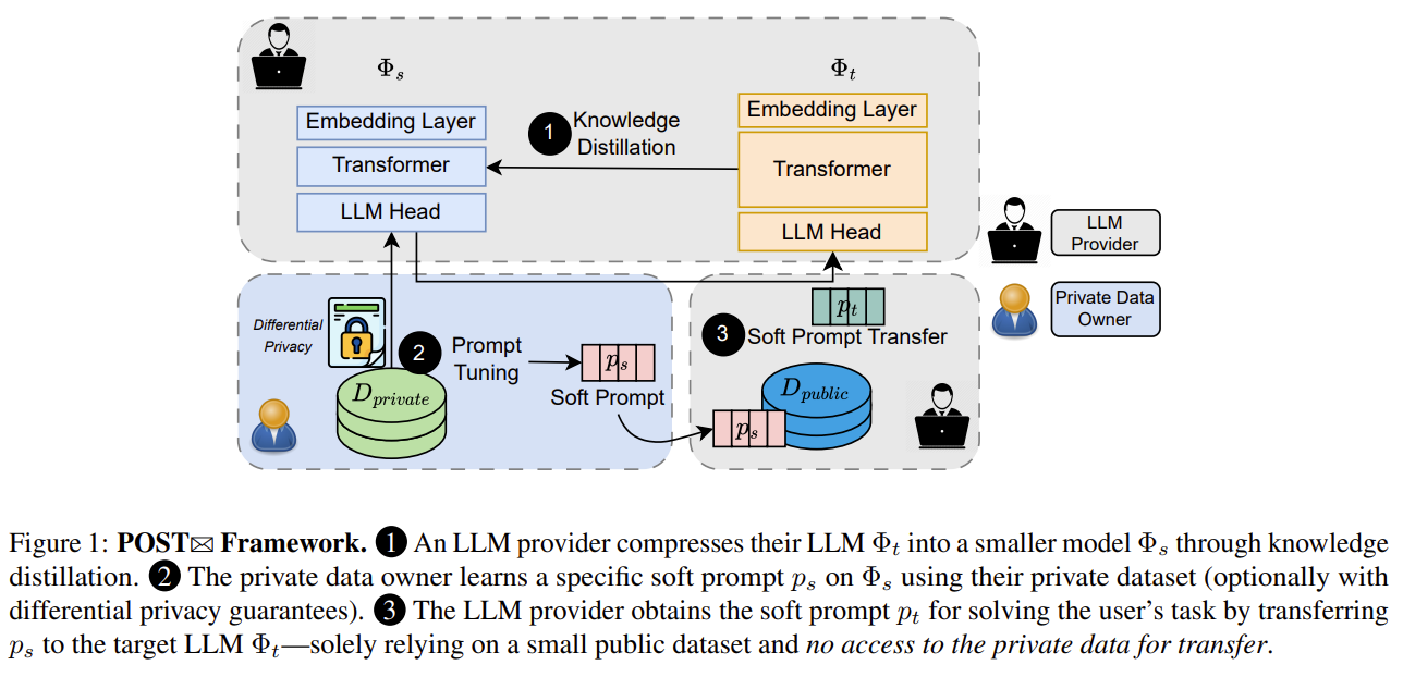 POST는 작은 모델에서 개인 데이터로 학습한 soft prompt를, private data 없이 public data만 이용해 큰 LLM으로 이전하는 첫 프라이버시 보존 soft prompt transfer 프레임워크이다.