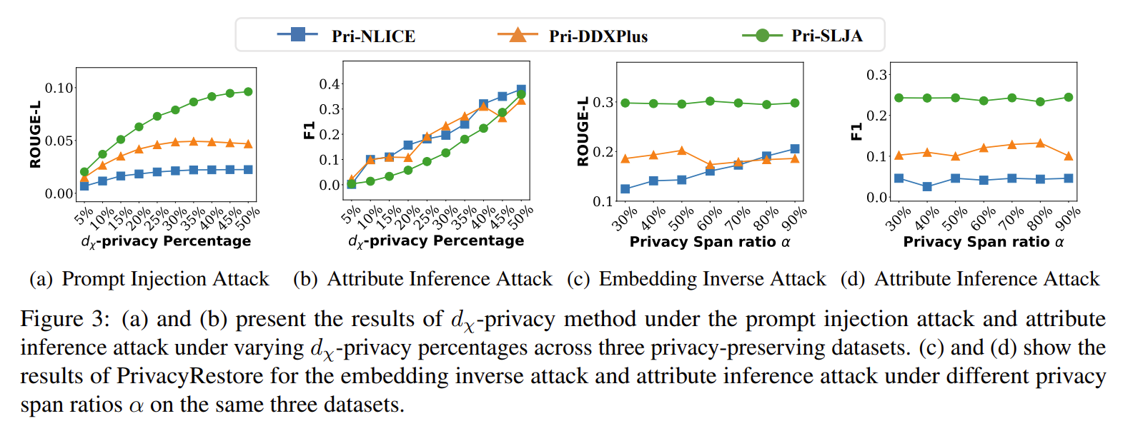 | 평가 데이터 | • Pri-DDXPlus, Pri-NLICE, Pri-SLJA 데이터셋(각각 의료/법률) • privacy span 삭제/복원 시나리오를 포함한 텍스트 • 공격 실험용 데이터: – embedding inverse attack input – attribute inference attack input – privacy occurrence 체크를 위한 생성 텍스트 |