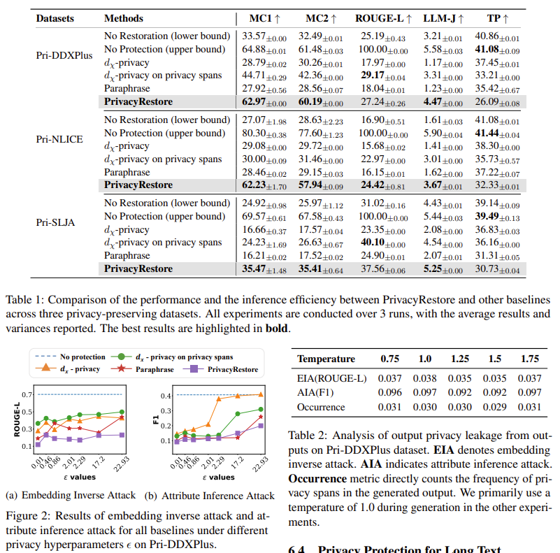 | 실험 요약 | • 비교 baseline: No Protection, No Restoration, dχ-privacy, dχ-privacy on spans, Paraphrase • 3개 privacy datasets에서 모든 방법 비교 • ε 변화에 따른 privacy–utility trade-off 분석 • temperature 변화에 따른 privacy leakage 평가 • embedding inversion, attribute inference, concatenated-text attack 등 다양한 공격 수행 |