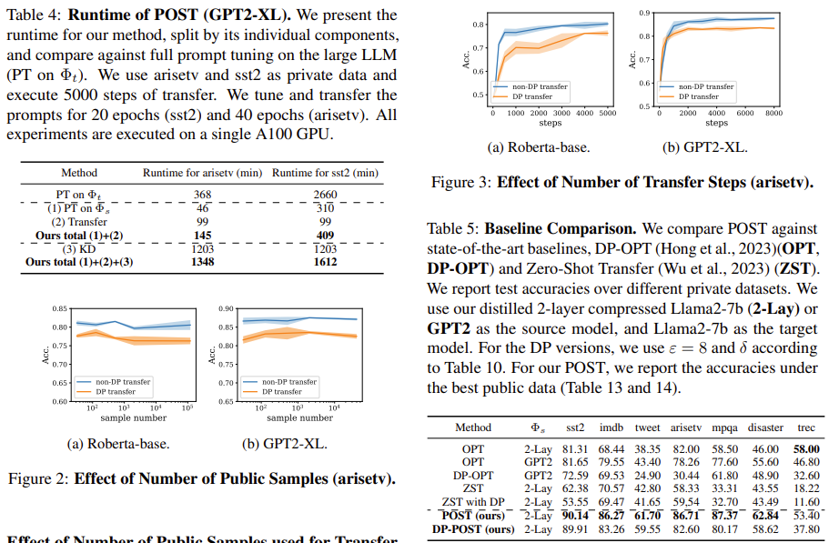| 방법론 | POST는 3단계 구조 (Figure 1 기반) 1) Knowledge Distillation (Provider 측): 원본 LLM Φᵗ → 작은 모델 Φˢ로 distill (12→2, 48→4 등). 학생 모델은 사용자가 로컬에서 튜닝 가능하며 teacher와 feature alignment 유지. 2) Private Soft Prompt Tuning (User 측): Φˢ에서 private data로 soft prompt pˢ를 tuning. PromptDPSGD 적용해 (ε, δ)-DP 가능. 데이터는 provider로 가지 않음. 3) Prompt Transfer (Provider 측): Private data 없이 public data x̂만 사용. → Loss = (1−α)·KL(Φᵗ(pᵗ+x̂), Φˢ(pˢ+x̂)) + α·KL(ΔΦᵗ, ΔΦˢ) → pˢ가 작은 모델에서 만든 “behavior + behavior shift”를 큰 모델에서도 재현하도록 pᵗ 학습. |