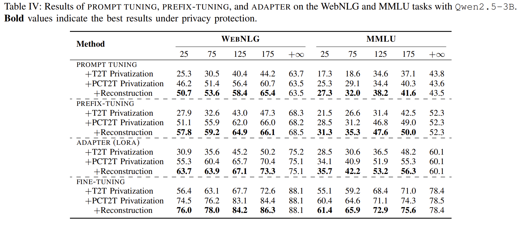 | 평가 데이터 | • 각 private dataset의 test split으로 평가. • Generation task는 정확한 label token을 생성하는지로 평가. • MIA(LiRA)를 통해 프라이버시 리스크 평가. |