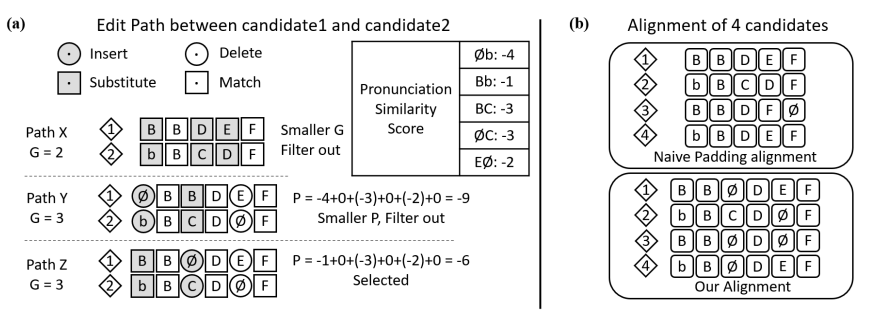근데 다른 논문들은 단순 padding을 맞추는데 여기선 발음 유사도와 edit path를 통해 의미 단위로 정렬함