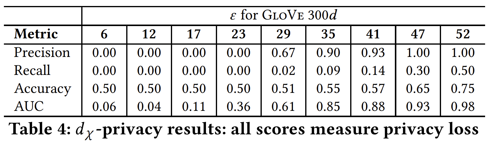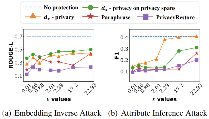 결국 dχ-Privacy는 기본 토큰 임베딩에 노이즈를 섞었을 때 원래 원본 토큰을 넣었을 때와 출력의 차이를 보고 이 논문에선 ε이 0이면 Privacy 보호가 잘 되지만 원본과 전혀 다른 출력이 나오고, ε가 커지면 이제 비슷한 분포가 되면서 출력이 비슷해지네요