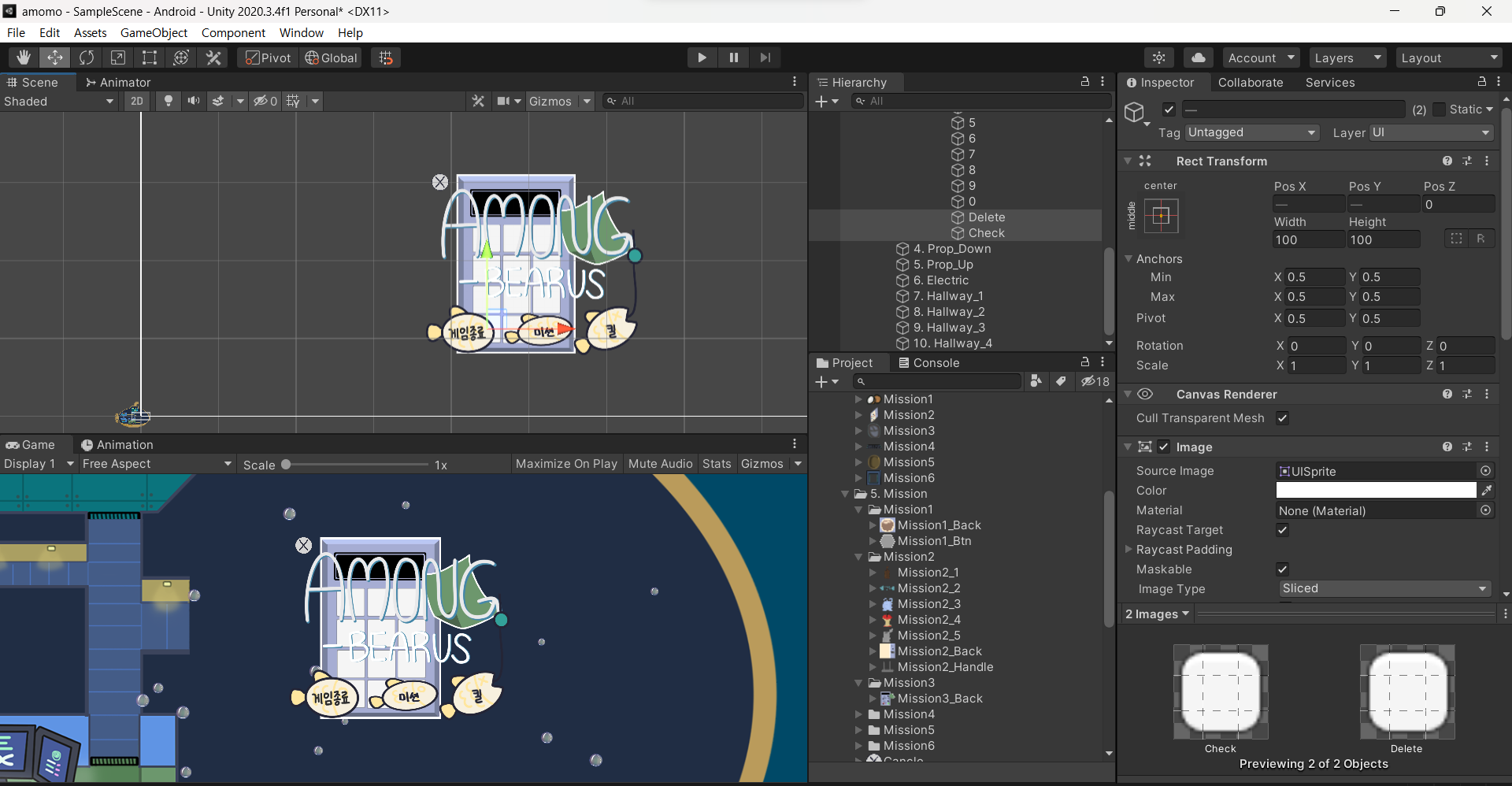 배경도 바꿔주었고, 마우스 사진의 콜라이더도 닿을 수 있는 부분으로 오프셋 수정도 하였다. 그리고 복붙한거기 때문에 있는 스크립트도 삭제하여주고, 필요없는 버튼들 삭제 후 캔슬버튼 위치만 옮겨주었다.