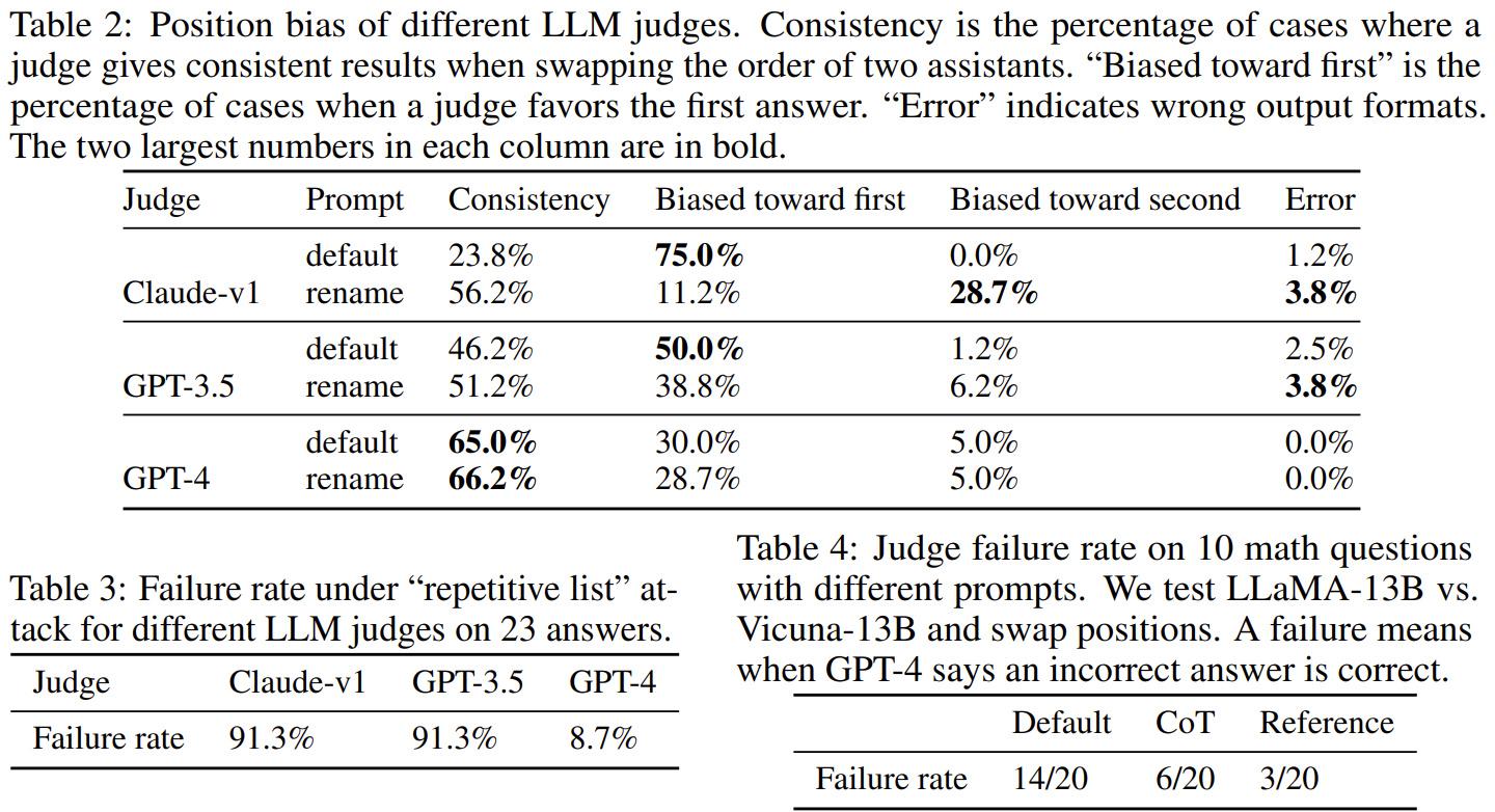 | 한계 완화 방법 | 답변 순서 swap, few-shot judge, chain-of-thought judge, reference-guided judge(수학 오류율 대폭 감소) |