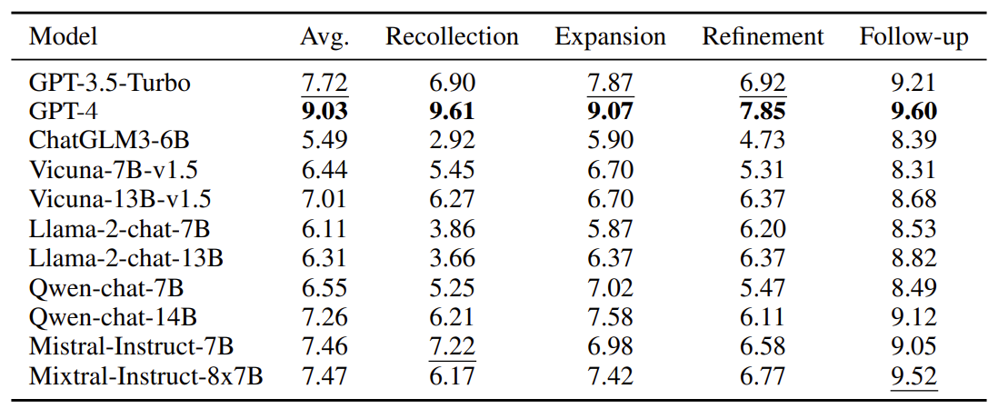 | 평가 대상 모델 | GPT-4, GPT-3.5-Turbo, ChatGLM3-6B, Vicuna(7B/13B), LLaMA-2-chat(7B/13B), Qwen-chat(7B/14B), Mistral-7B, Mixtral-8x7B |