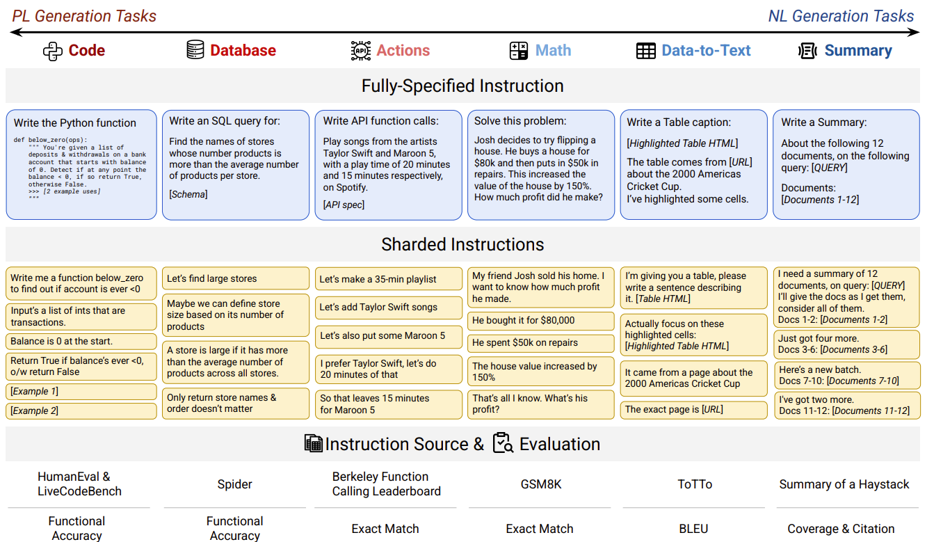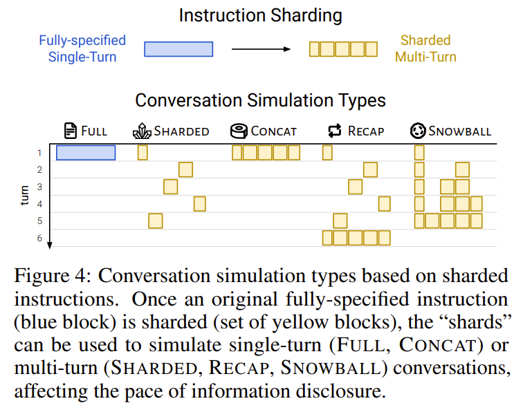 기존 single-turn benchmark를 정보 조각 단위로 분해해서 턴당 1개의 shard만 공개하여 마지막 턴에 모든 정보가 주어지도록 설계되어있다.