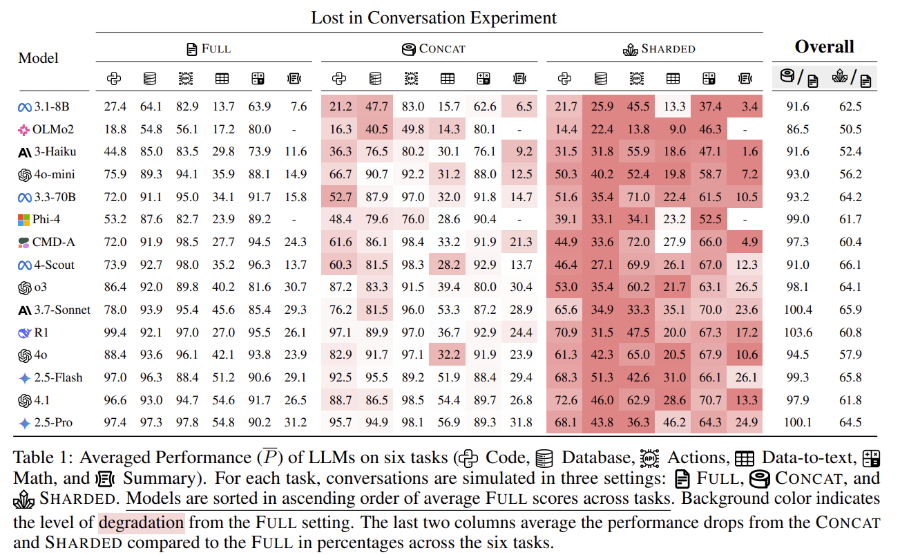 | 비교 설정 | FULL: 모든 정보 1턴 제공 (single-turn baseline) CONCAT: multi-turn이지만 모든 과거 정보를 누적 제공 SHARDED: 턴마다 일부 정보만 공개되는 진짜 multi-turn underspecified 대화 |