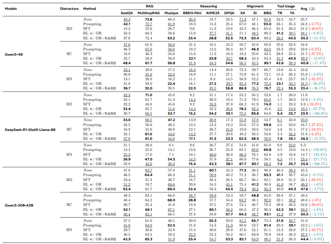 | RARE 효과 | Distracted CoT 감소, Noise filtering 능력 향상 평균 성능 +55% 개선 |