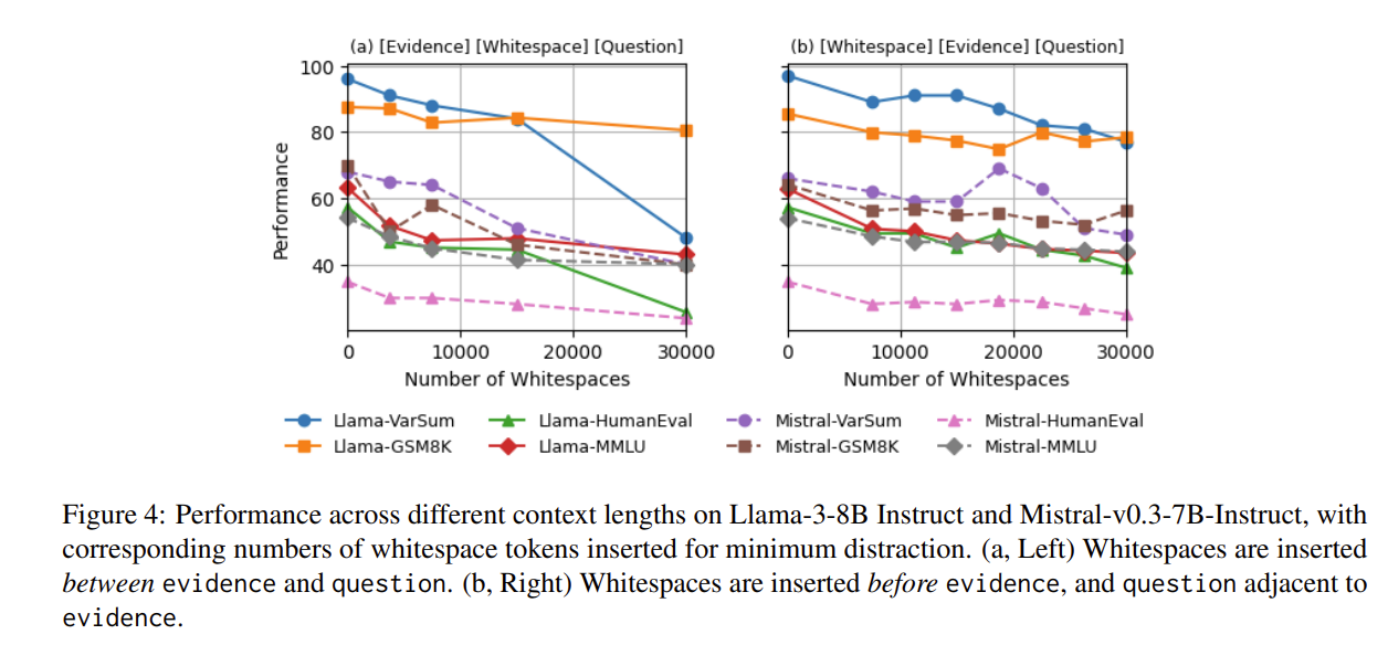 | 핵심 결과 ② | Whitespace·Masking 상황에서도 성능 저하 발생 → distraction 원인 아님 |