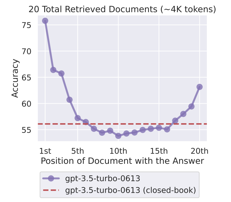 | 핵심 결과 ② | • GPT-3.5는 중간 위치에서 문서 제공 안 한 closed-book 성능보다 더 낮아짐 • Extended context 모델(16K, 100K)도 동일한 현상 → 컨텍스트 길이 증가 ≠ 활용 능력 향상 |
