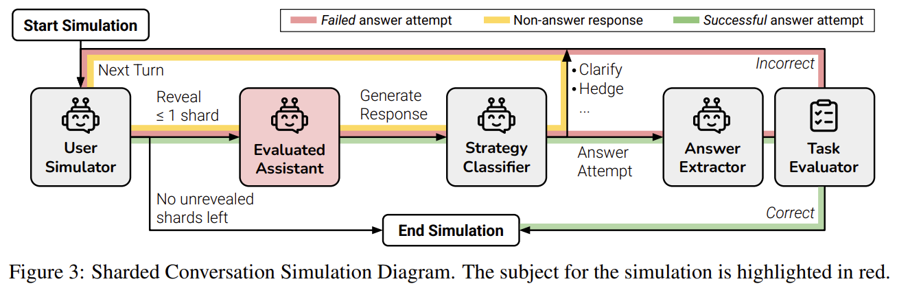 | 방법론 | 기존 single-turn 벤치마크를 정보 단위로 분해하는 Sharded Multi-Turn Simulation 제안. 한 턴당 하나의 정보 shard만 공개하여 실제 underspecified 대화를 모사 |