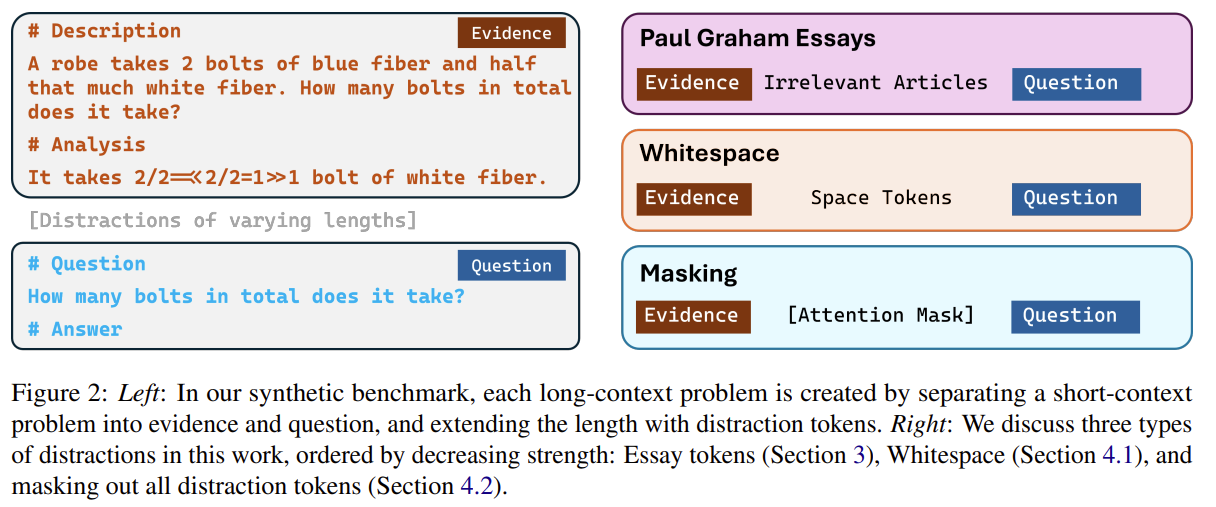 | 실험 핵심 아이디어 | Short-context 문제를 [Evidence + Distraction + Question] 형태로 확장하여 길이만 증가 |