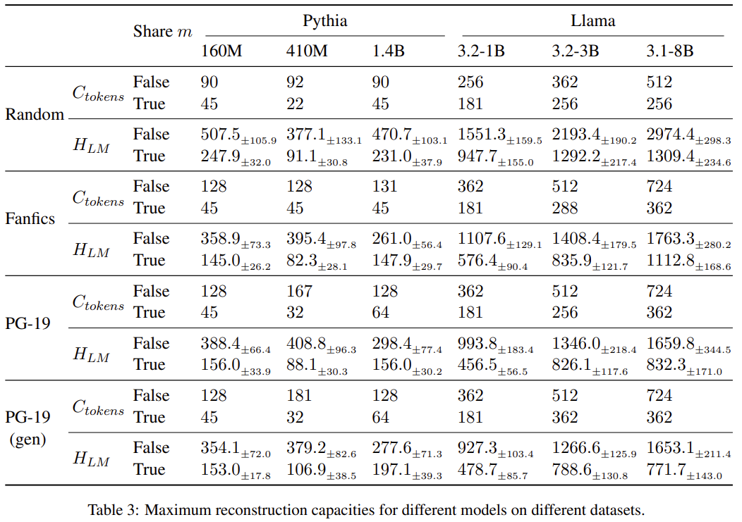 | 성능 결과 | • LLaMA-3.1-8B: 최대 ~700 토큰 정확 복원 • Pythia 계열은 모델 크기 증가 ≠ 성능 증가 |