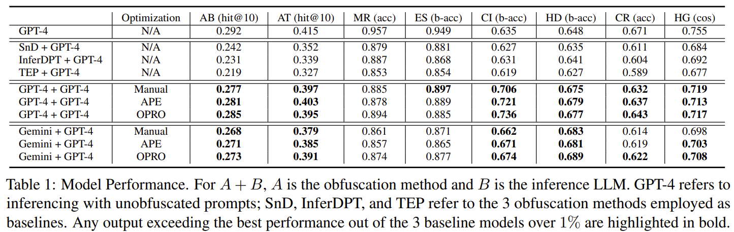 | 주요 결과 | 난독화 후에도 성능 유지 또는 일부 향상, 기존 프롬프트 프라이버시 기법(SnD, InferDPT, TEP) 대비 동등 이상 성능. |