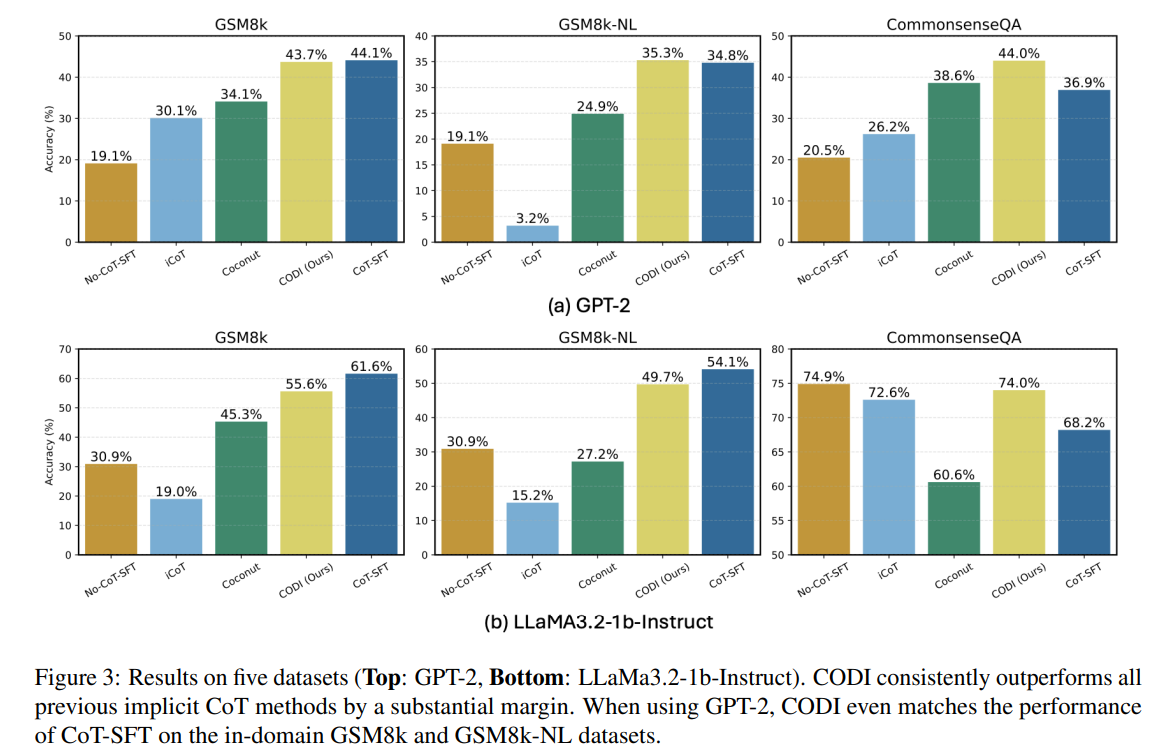 | 데이터/비교 | 학습: GSM8k-Aug / GSM8k-Aug-NL / CommonsenseQA-CoT(자체 생성). 비교: No-CoT-SFT, CoT-SFT, iCoT, Coconut, CODI. |