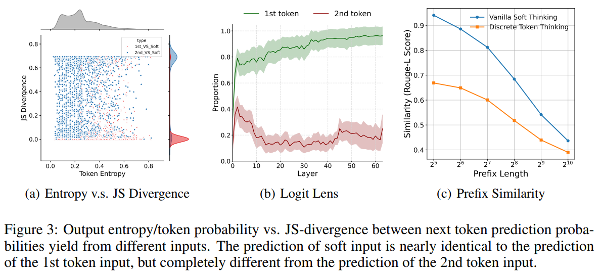 | 분석/증거 | (1) Soft 입력 vs top-1 입력의 다음 분포가 JS divergence≈0, 반면 top-2 입력과는 크게 다름(soft가 사실상 top-1처럼 작동). (2) Logit Lens로 레이어 진행 시 top-1 경로 점유율이 1.0으로 수렴(forward가 pruning처럼 작동). (3) soft trace(top-1 연결)와 greedy trace의 ROUGE-L 유사도↑로 greedy화 확인. |