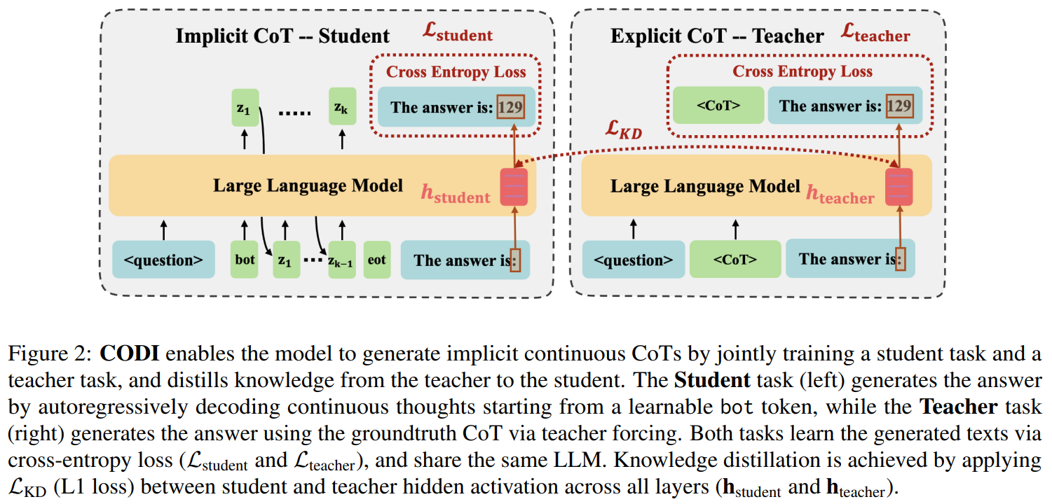 Teacher는 Explicit CoT를 진행하며 CoT 토큰과 정답 토큰을 학습하고, Student는 Implicit CoT를 진행하여 언어 토큰 생성 없이 hidden state를 생성하고, eot를 통해 답을 말하게 됨