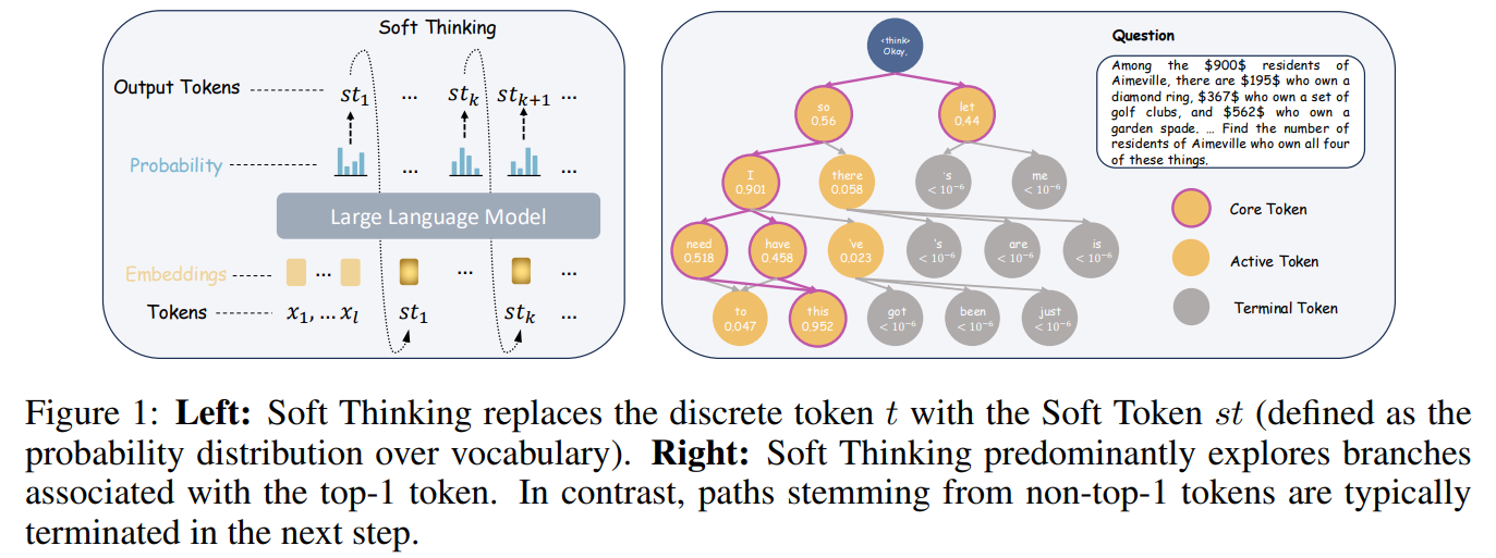 요즘 soft thinking은 토큰 하나 대신 여러 토큰을 통해 다음 스텝에 더 많은 정보를 넣어준다.