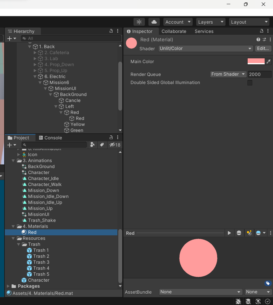이제 폴더를 만들었으면 폴더 안에 material을 하나 만들어주고, 그 것을 아까 만들었던 Red에 넣는다.