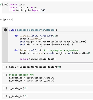 여기선 클레스로 만드네요. 9개의 파라미터(feature도 9개다.)를 만들어서 곱해주고, 바이어스 하나 더해줘서 전진하는 것 만들었습니다. 그리고 sigmoid도 한번 적용해줍니다.