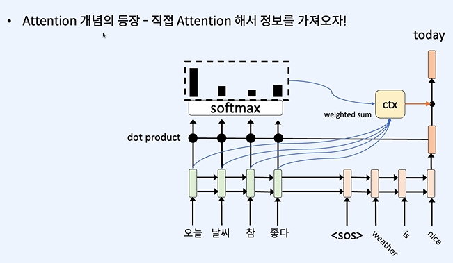 필요한 정보들의 스코어(soft max를 한 attention score)와 가중합을 통해 ctx를 만들어서 연산을 통해 합치고 today가 나오게 된다.