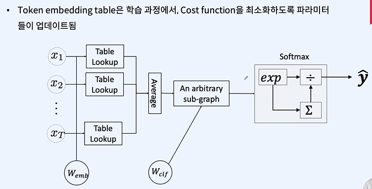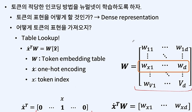 테이블 룩업(Table Lookup): 원-핫 인코딩된 벡터를 사용하여 임베딩 테이블에서 해당 토큰의 임베딩 벡터를 검색합니다. 이는 원-핫 벡터(x̂)와 임베딩 테이블(W)의 곱셈으로 이루어지며, 실제로는 원-핫 벡터가 테이블에서 해당 인덱스의 벡터를 "선택"하는 것과 동일합니다.